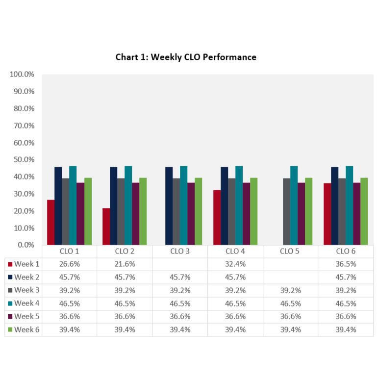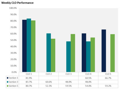 After analyzing the lessons in the context of the course and learners’ experience, I concluded that the course could be strengthened by including more scaffolding through structured activities, guided practice, and timely feedback. Furthermore, collected data showed that performance for most learning outcomes declined after the first section of the course (see the chart below), supporting the need for cognitive load management, progressive skill-building, and learner confidence.