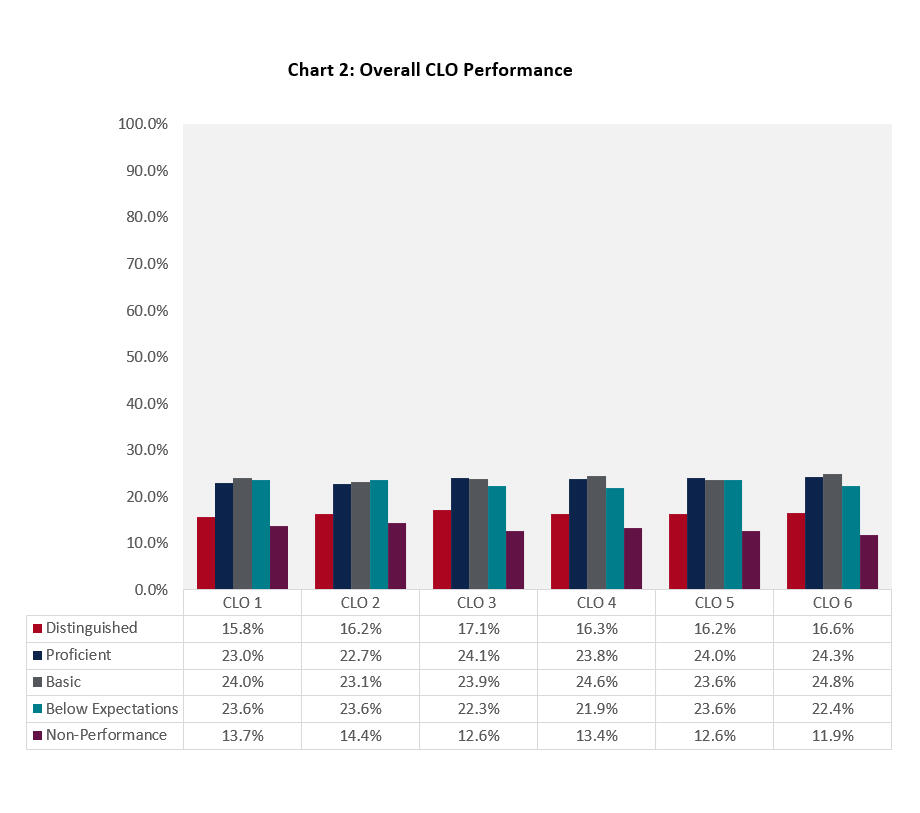 As the ADDIE model suggests, I began with analysis by meeting with the project owner to understand the big picture problems and project goals. I reviewed the course and existing assessments, and interviewed students and other SMEs.As institutional stakeholders highlighted, there was a need to meet learning objectives better. As seen below, the success of the objectives was underperforming both while the course progressed (Chart 1) and after it was completed (Chart 2).