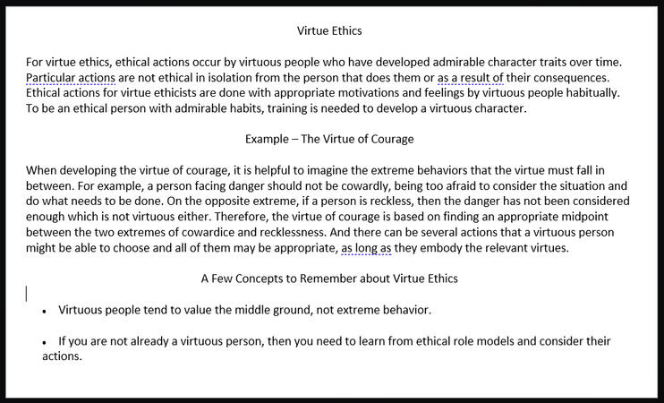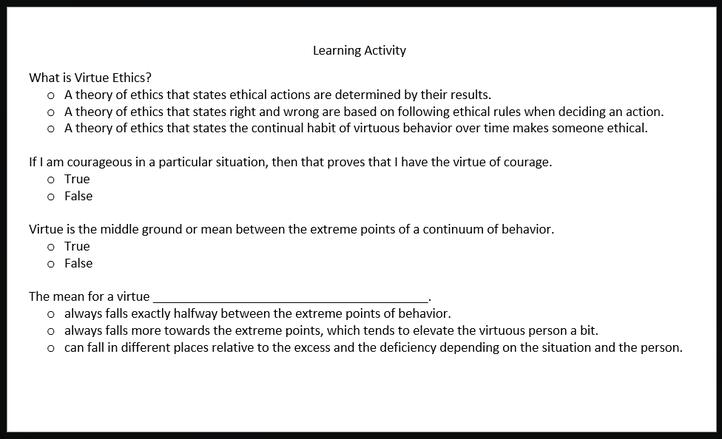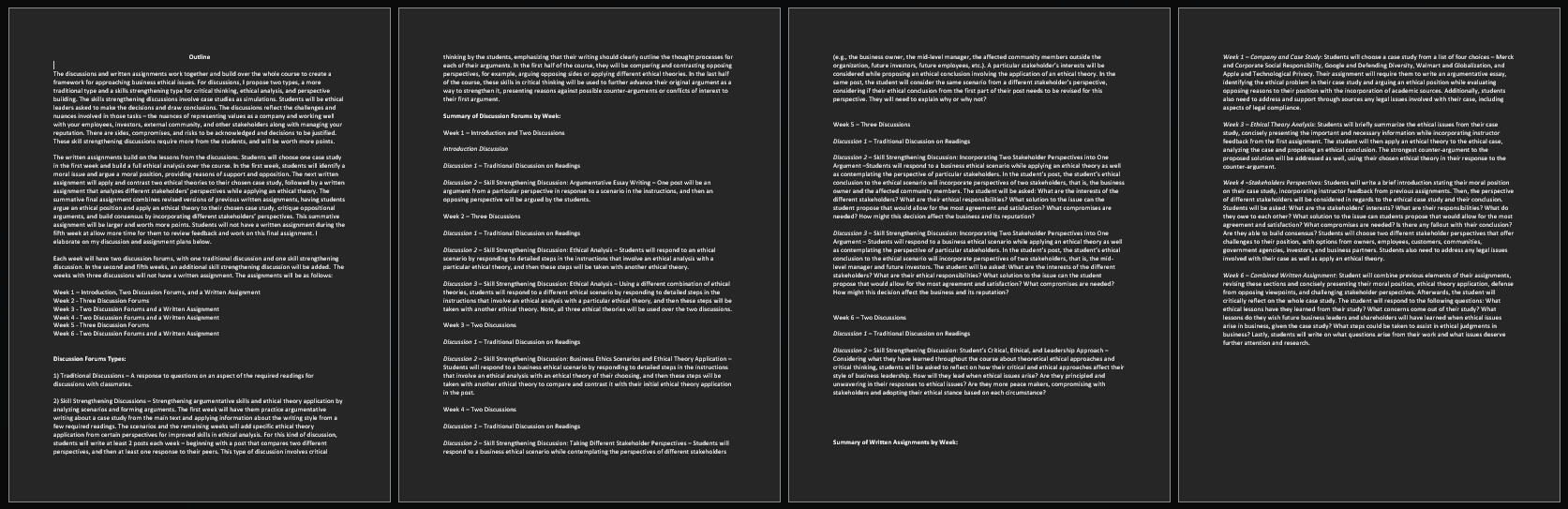 A clear synthesis of three weeks of lessons on philosophical theories was needed, unifying the learners’ experiences while also explaining how to put the lessons into practice. The learning objective was the application of key philosophical theories to practical ethical practice in realistic scenerios.